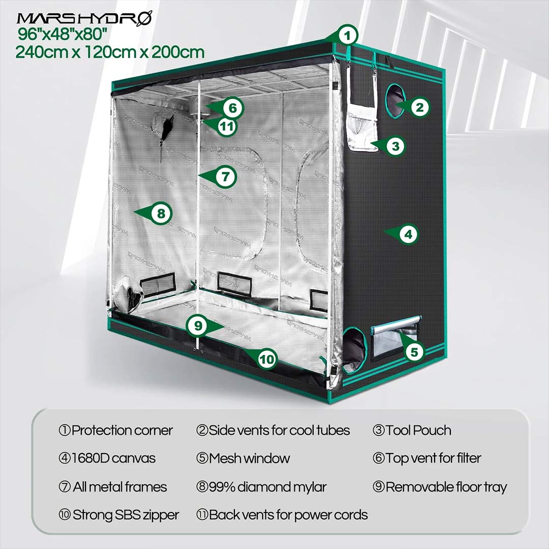 El interior de las carpas MarsHydro están hechas de Mylar®, una lona de alta calidad 1680D de doble cocido, no tóxica ni para el medio ambiente ni para tus plantas (las otras marcas son solamente de lona 601D) siendo la lona perfecta por su inigualable reflejo de la fuente de luz emitida, llegando a todos los rincones y a prueba de rasgaduras!