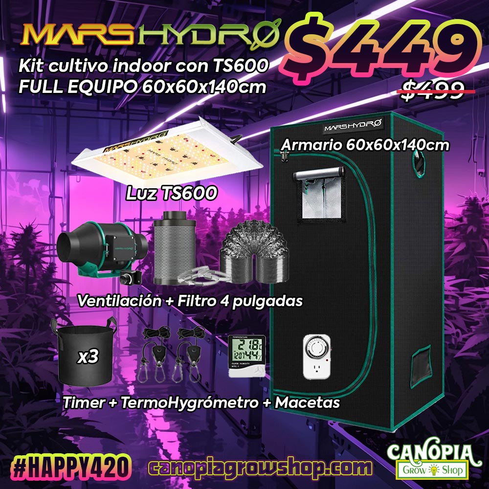 Todo lo necesario para empezar un cultivo indoor con carpa, luz TS 600 con espectro completo para todas las etapas, sistema de ventilación con filtro de carbón activado para eliminar olores. el Kit de cultivo Marshydro de 60x60x140cm entrará en cualquier rincón por su tamaño compacto. ¡Llévate el kit completo!